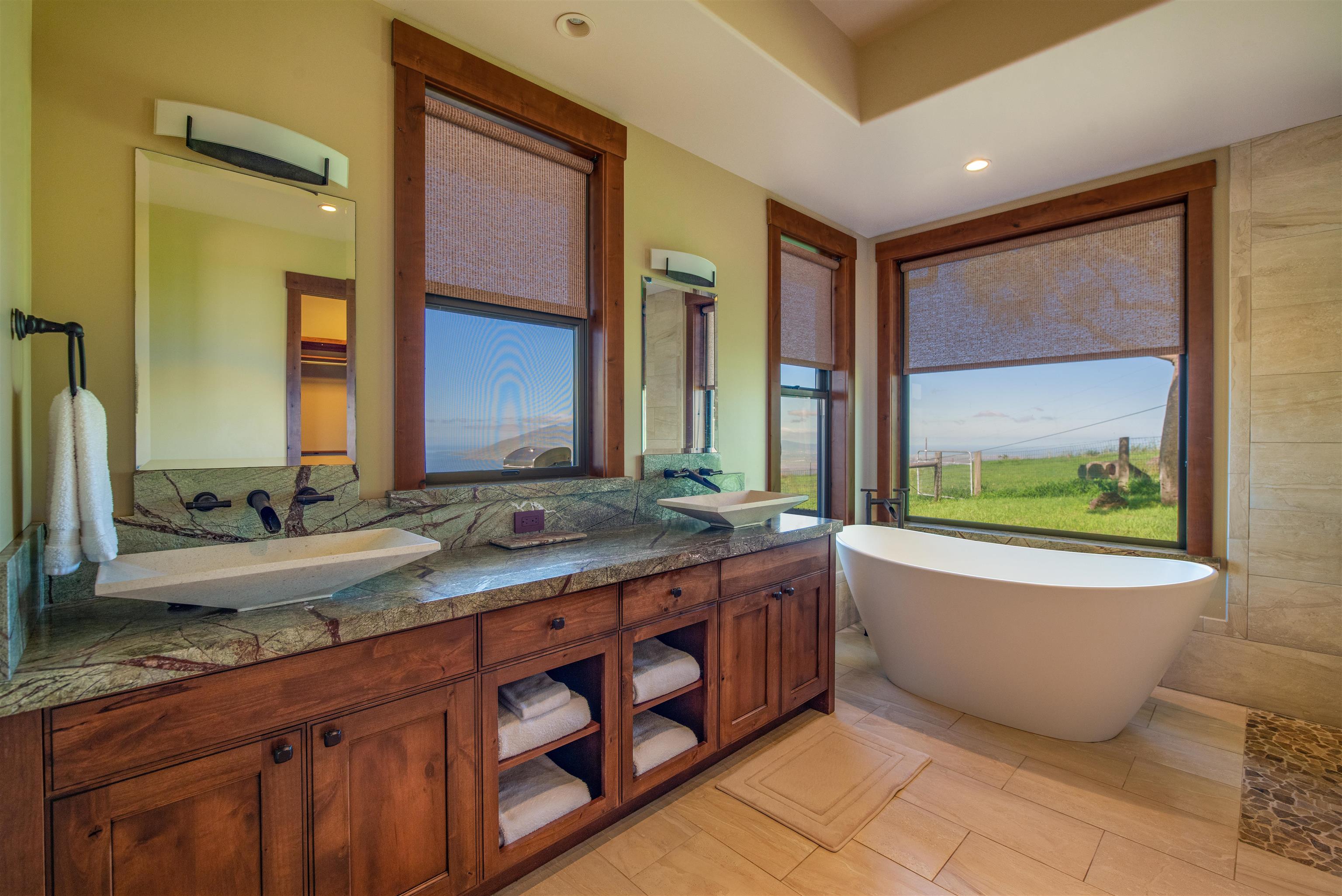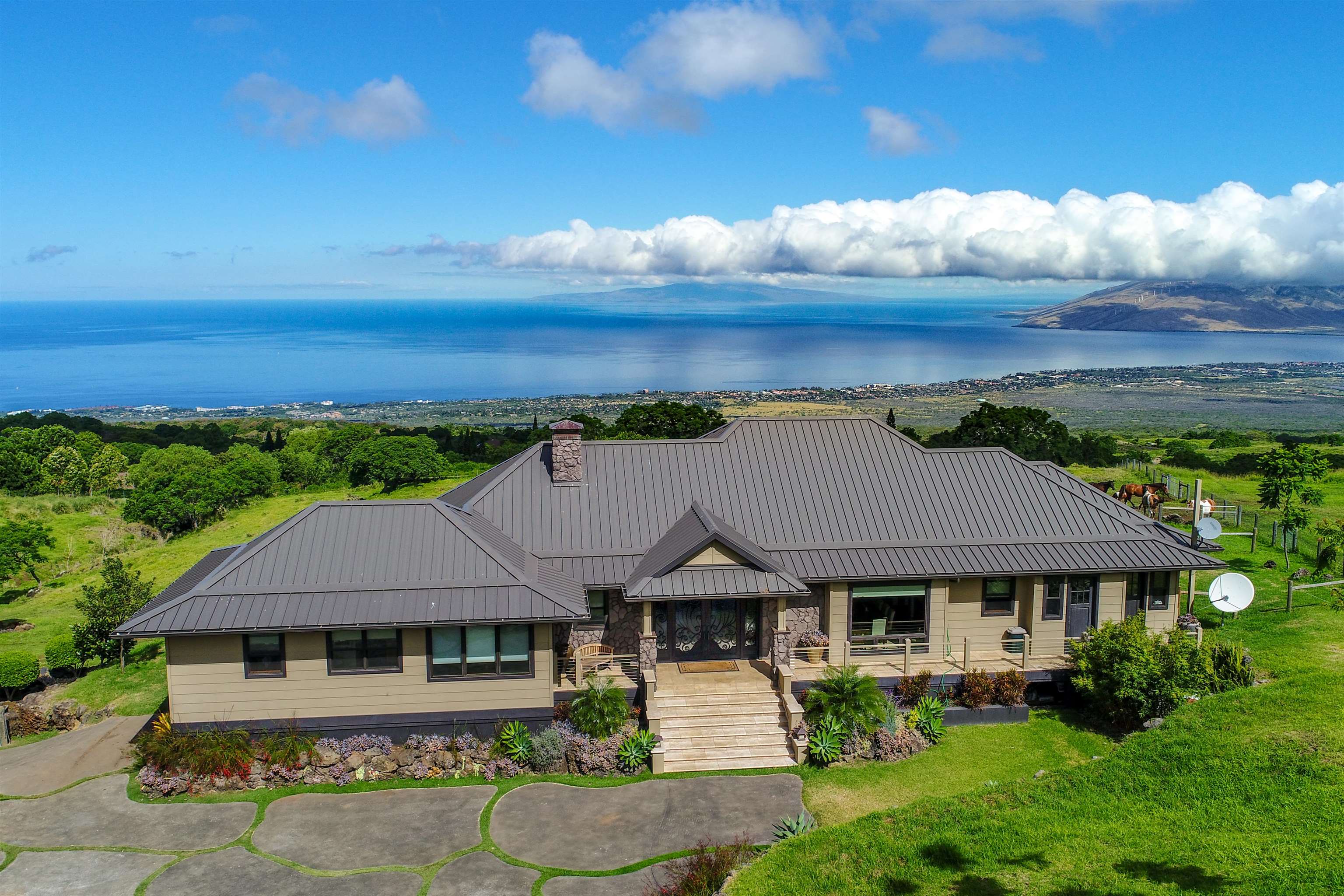 A truly rare offering in coveted Keokea. This exceptional Upcountry estate is perfectly positioned between Kula and Ulupalakua, presenting an unparalleled living experience in one of Maui's most sought-after areas. Surrounded by sweeping natural beauty and rich island heritage, Keokea embodies tranquility and timeless charm. Set on 6.5 acres of meticulously manicured grounds, the property offers remarkable privacy while remaining conveniently close to shops, dining, and endless outdoor pursuits. Unobstructed ocean and Haleakala views serve as a breathtaking backdrop from every vantage point. Offered for sale by the original owner--renowned builder Keith Troxel--this custom, rustic-contemporary ranch-style residence is ideally situated at 2,300 feet in elevation, just below the Oprah Winfrey Estate and Sun Yat Sen Park. Enter through solid wrought iron doors that open to the elegant main residence with two primary suites thoughtfully positioned at opposite ends of the home for enhanced privacy. Interiors are appointed with acacia wood and travertine flooring throughout, while the expansive chef's kitchen showcases a custom Monkeypod wood island, premium appliances, and granite countertops--perfect for both entertaining and everyday living. Seamlessly blending indoor and outdoor living, the home opens to an expansive lanai overlooking a resort-style pool and spa, set amidst park-like grounds and framed by panoramic ocean vistas. Enhancing the estate is a beautifully designed carriage-style cottage with a three-car garage below, offering flexibility for guests or extended living. The property is fully fenced and gated, complete with a barn and arena, and features a large 3/4-inch water meter, allowing for potential future expansion. This is a once-in-a-lifetime opportunity to own a slice of heaven that is so unique, you will not find it anywhere else on Maui. Lister is owner.